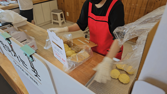 한쪽에서는 열심히 반죽에 팥을 넣고 있고