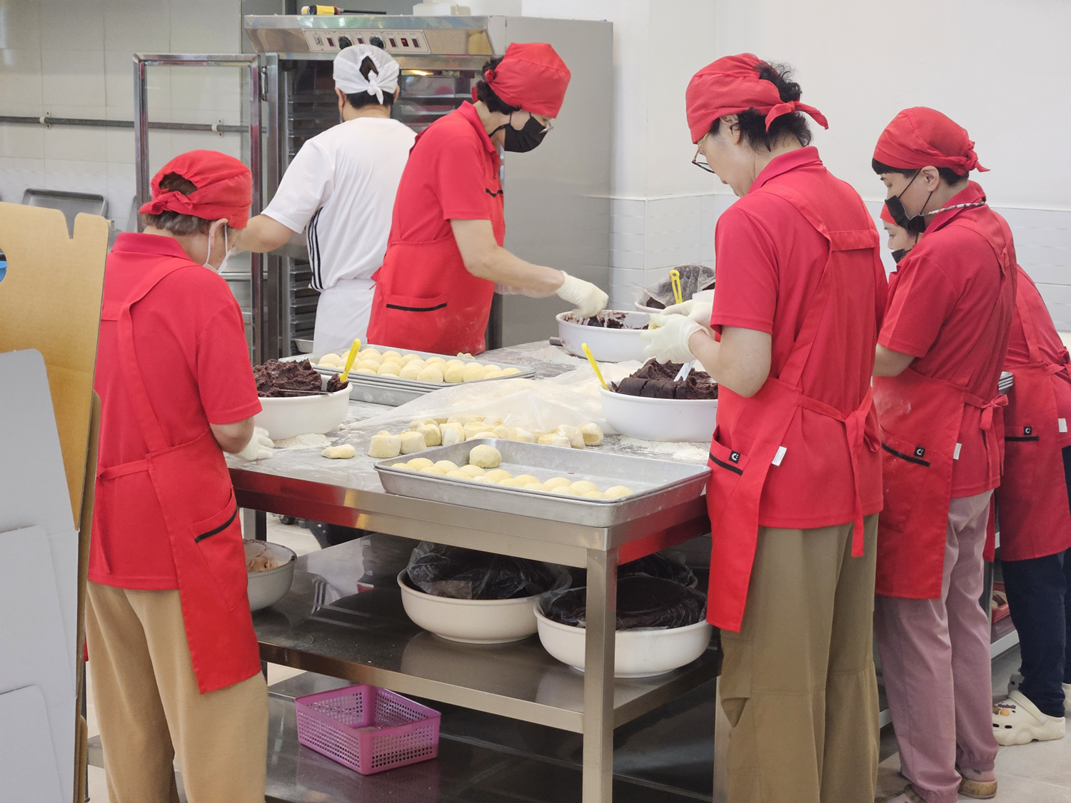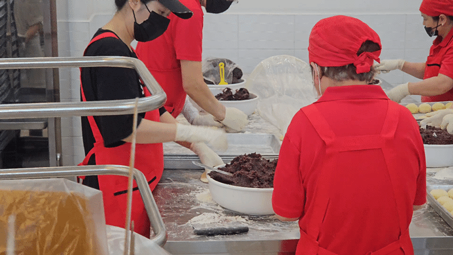 한쪽에서는 열심히 반죽에 팥을 넣고 있고