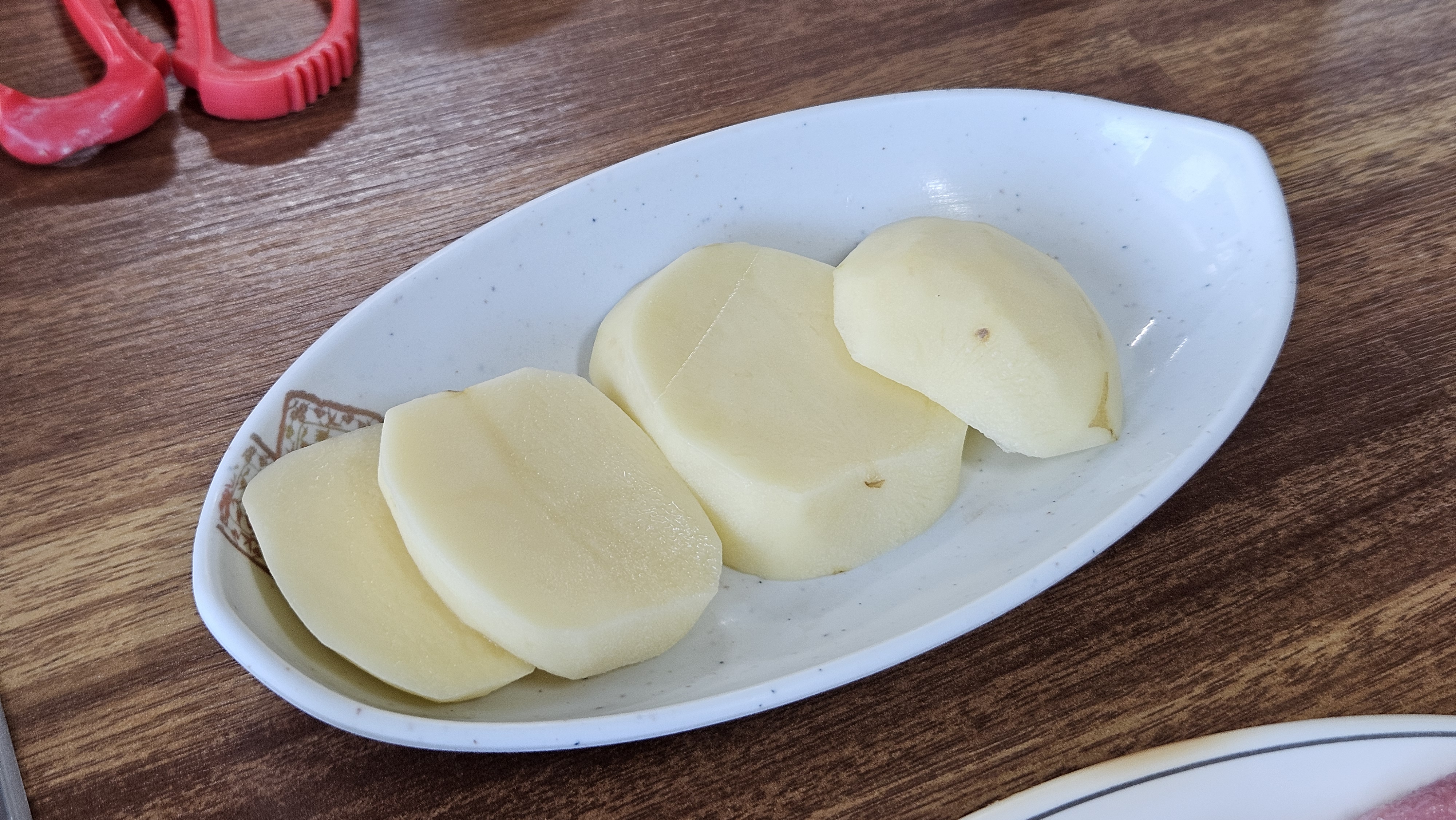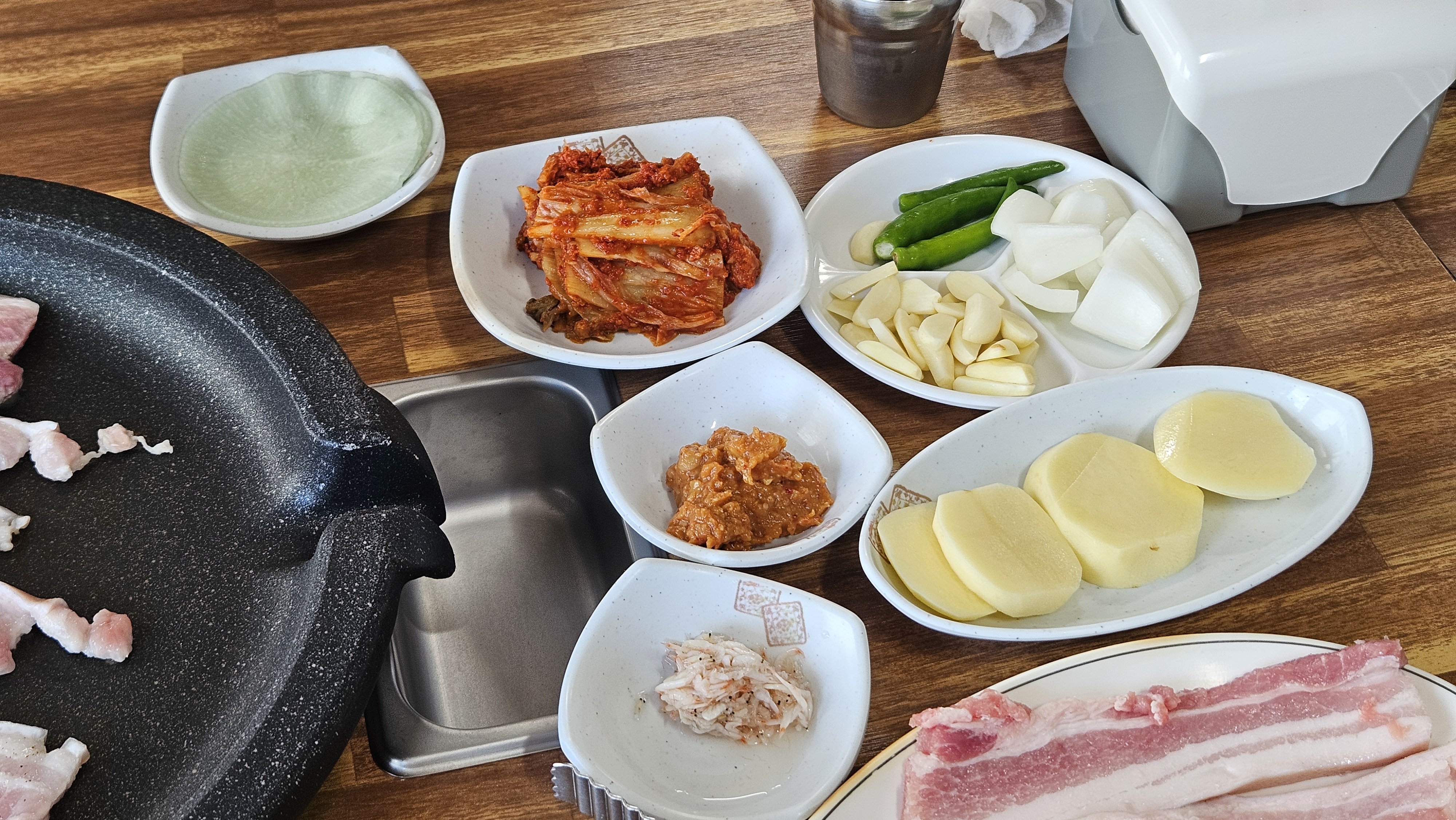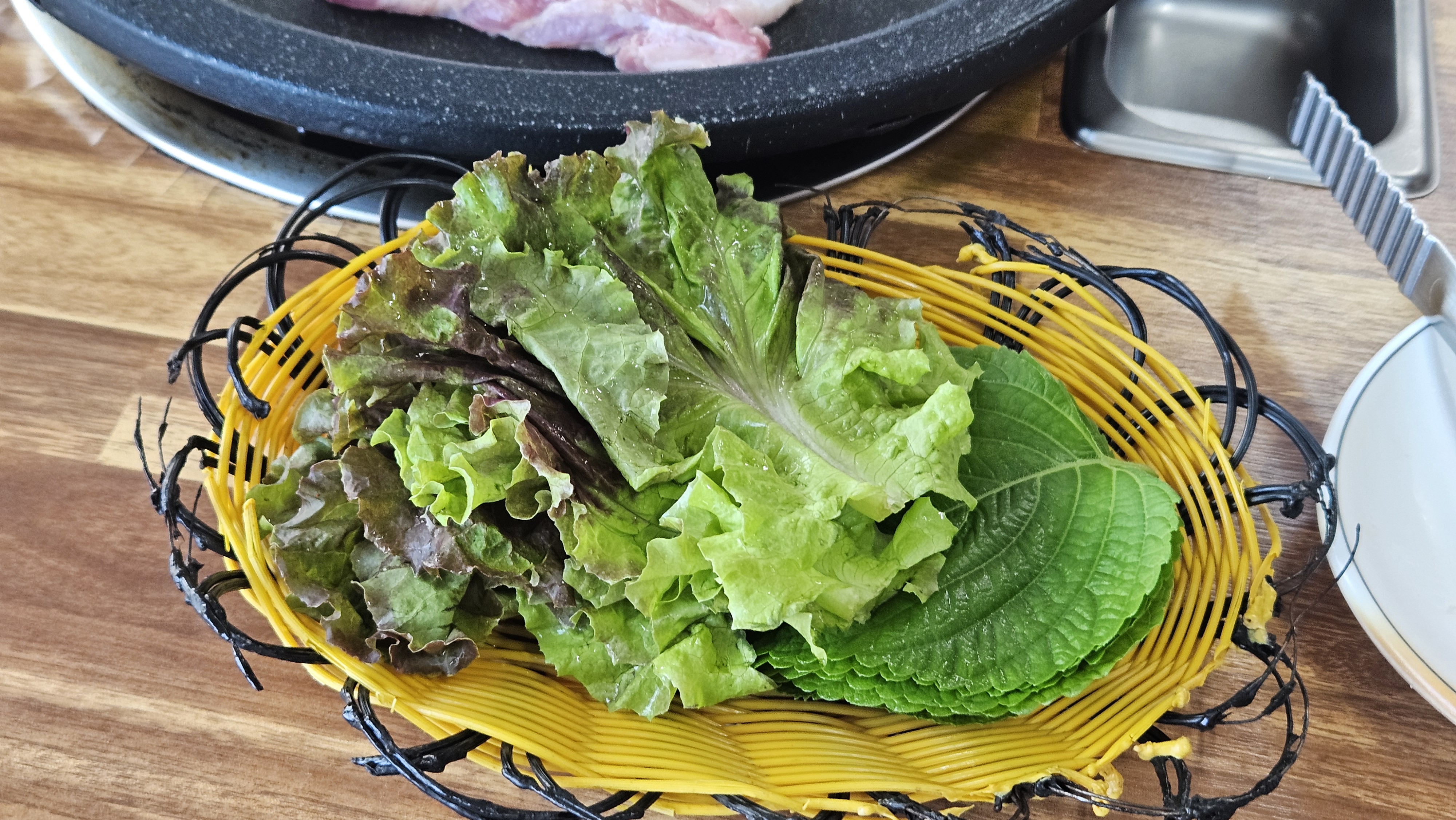 상추, 감자, 고추, 마늘, 양파, 김치, 쌈무, 새우젓, 된장까지