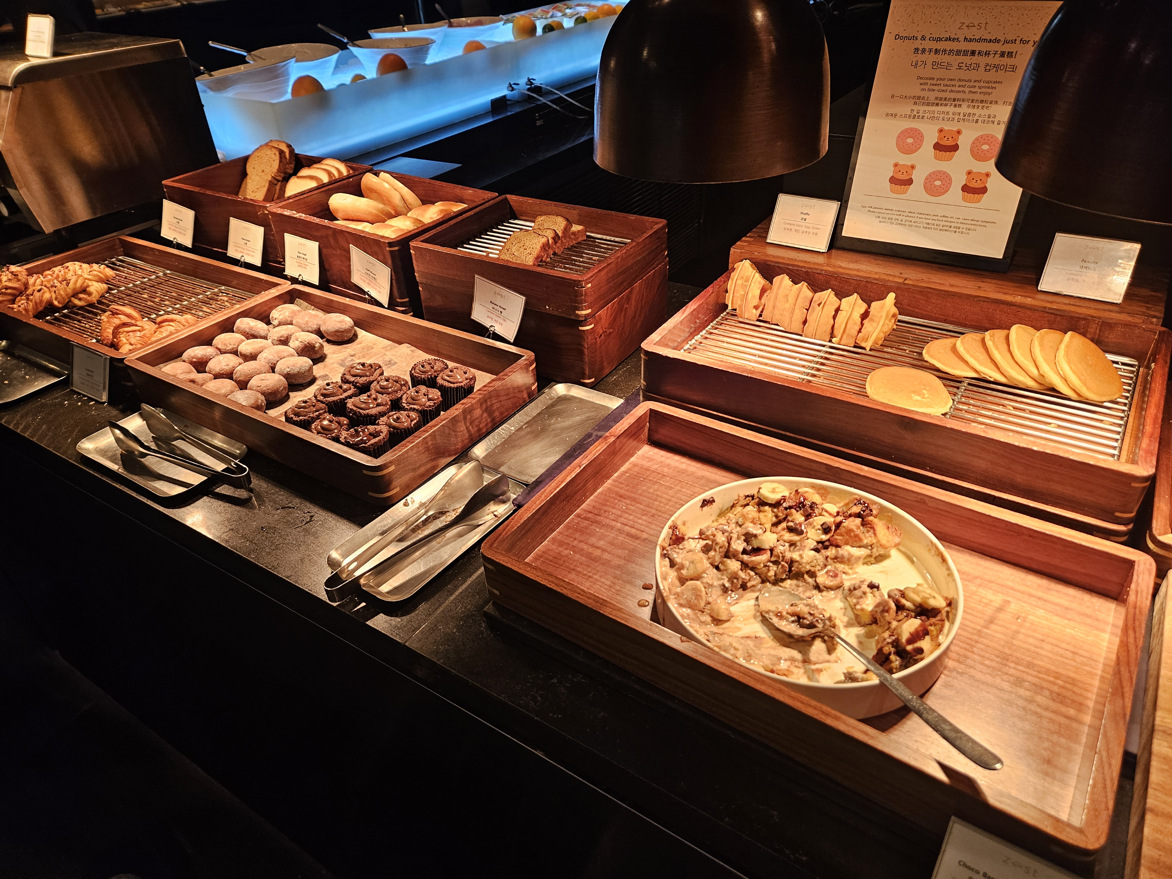 서양의 조식뷔페 느낌이 물씬 나는 음식들이 있습니다.