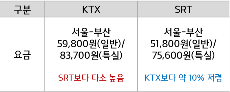 SRT가 KTX보다 약간 저렴한 경우가 많습니다.