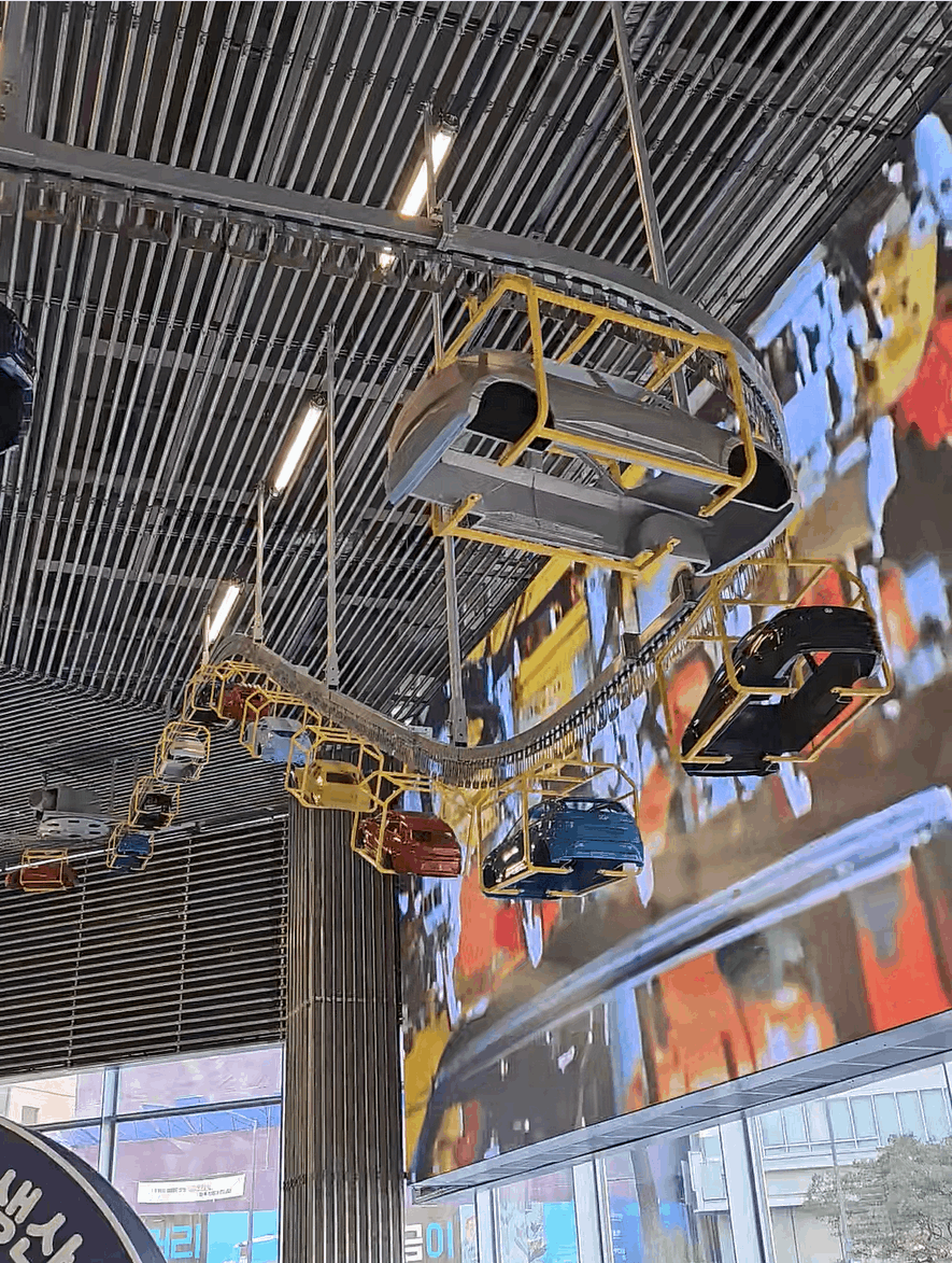그리고 천장을 보면 컨베이어 벨트 조형물에