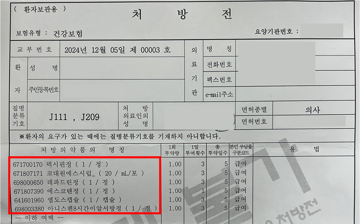그런데 아래 처방받은 약품의 항목을 검색해보면