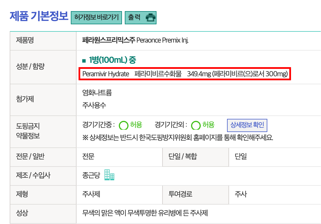 세부내역서를 보니 "페라원스프리믹스주(페라미비르수화물)" 주사제에서