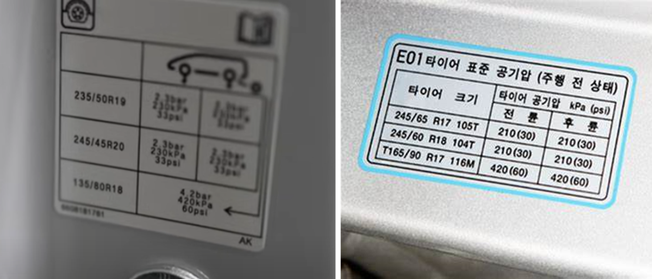 자동차 제조사에서 제공하는 타이어 권장 공기압은