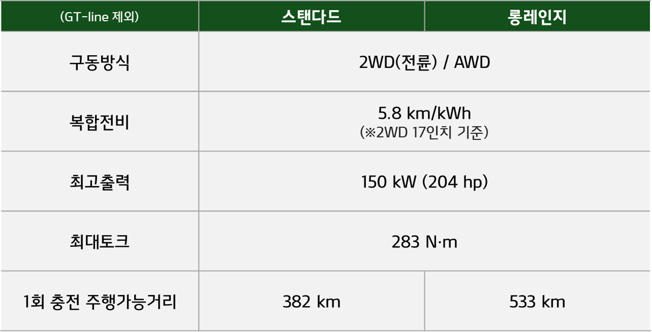 WLTP 기준 430(스탠다드)~630(롱레인지)km의