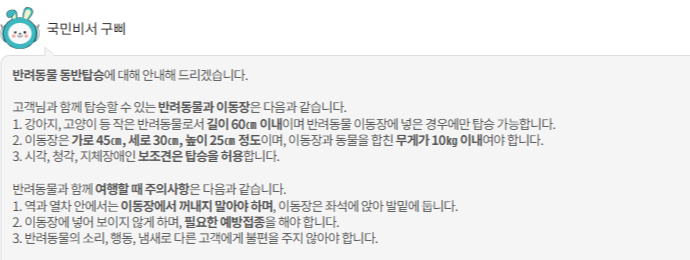 - 안타깝게도 반려동물은 여객운송약관에 의거 좌석을 지정하여 열차를 이용하는 것이 불가능