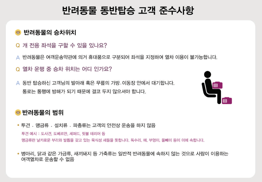 - 안타깝게도 반려동물은 여객운송약관에 의거 좌석을 지정하여 열차를 이용하는 것이 불가능